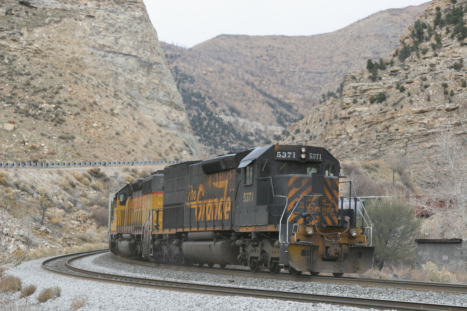 Something interesting happened about that point, though. I heard a manifest leaving Helper, and it was talking to its helper set. Since the big, all-AC4400CW set went over the hill in the morning, it had to be DRGW 5371 and that SD40-2 from yesterday! Here they are at Utah Railway Junction, just outside Helper.