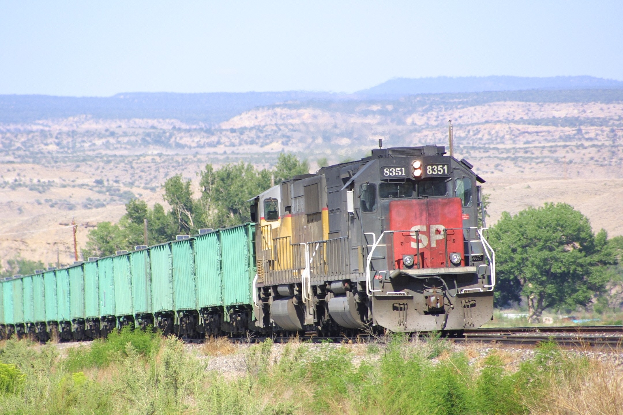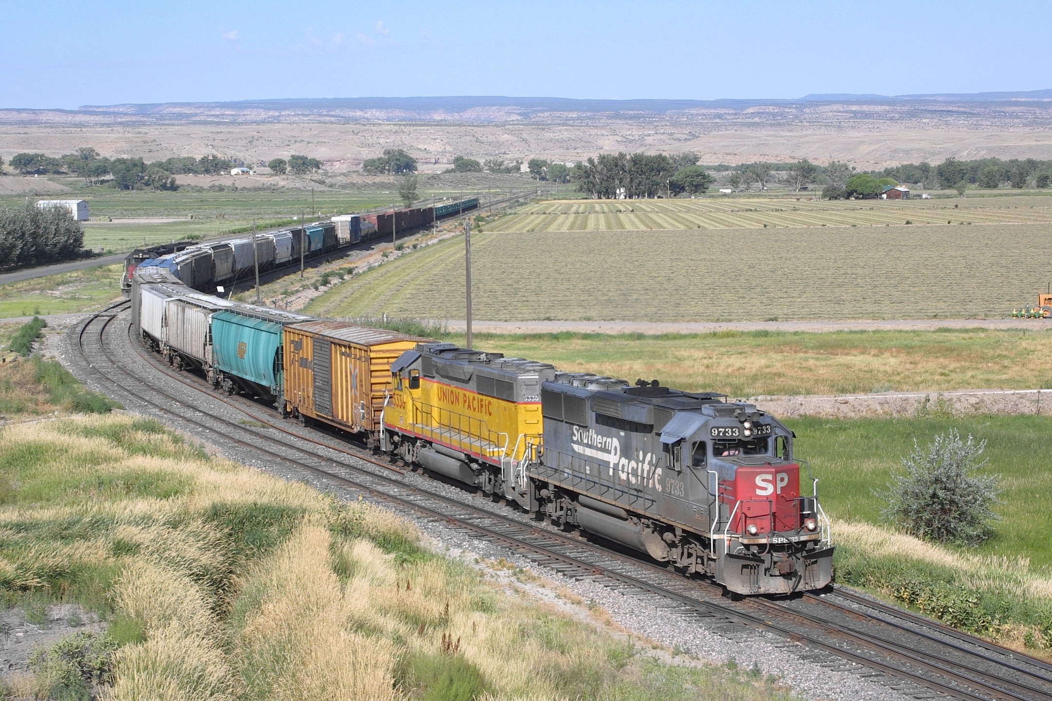 For those unfamiliar with the territory, there are two weekly locals that run out of Grand Junction, CO. One runs south along the North Fork sub to Delta, CO, where it switches local industries and then continues south to Montrose along the original D&RGW mainline (back in the days when D&RGW was synonymous with three footers, but the line is now long since standard gauged). Typically, it seems to draw a pair of four-axle units for power. The other local runs west to Brendel, UT (also called Crescent Junction), where it turns south towards Moab on the Cane Creek Branch. It’s main purpose is to serve a mine at Potash, UT, just northwest of Moab, and hence is usually known as the Potash local. Typically, I’ve understood that this train draws several six-axle units for power, and hauls large cylindrical hoppers as its main cargo.
