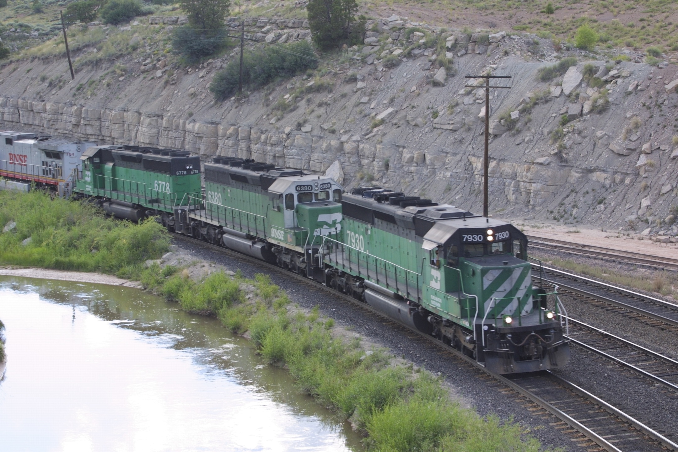 Only minutes behind the empty was a westbound BNSF manifest, lead by a nice, clean Heritage II GE unit. (Photo #38) The especially odd thing was that this manifest not only had power on the front, but also had a DPU GE tacked on the back! (Photo #39) This is apparently a new thing for BNSF on the ex-Grande, as I’ve never seen it and there was mention of it being a new strategy on the D&RGW list when I arrived back at home on Sunday night.