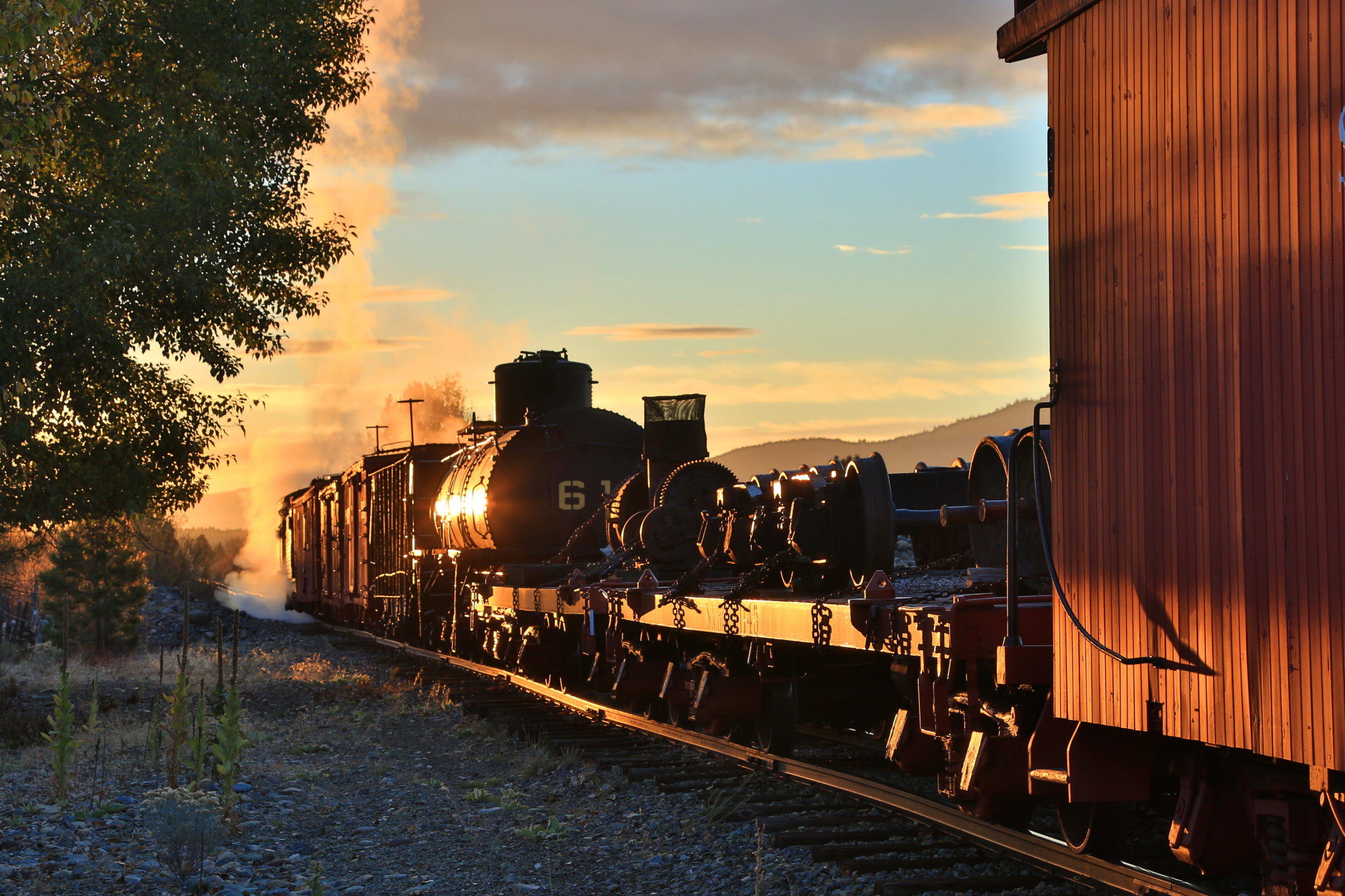 The weather for both days was cold and crisp under clear skies, except for some light clouds the first morning. As is typical in the mountain west, it didn’t stay cold once the sun was up and warmed up nicely during the day. Both days the train was the same – Sumpter 19 in the lead, two boxcars, a hopper, a tank car, two flats, an SVRy caboose, and original 1890 SVRy coach #20 on the rear to haul us around.