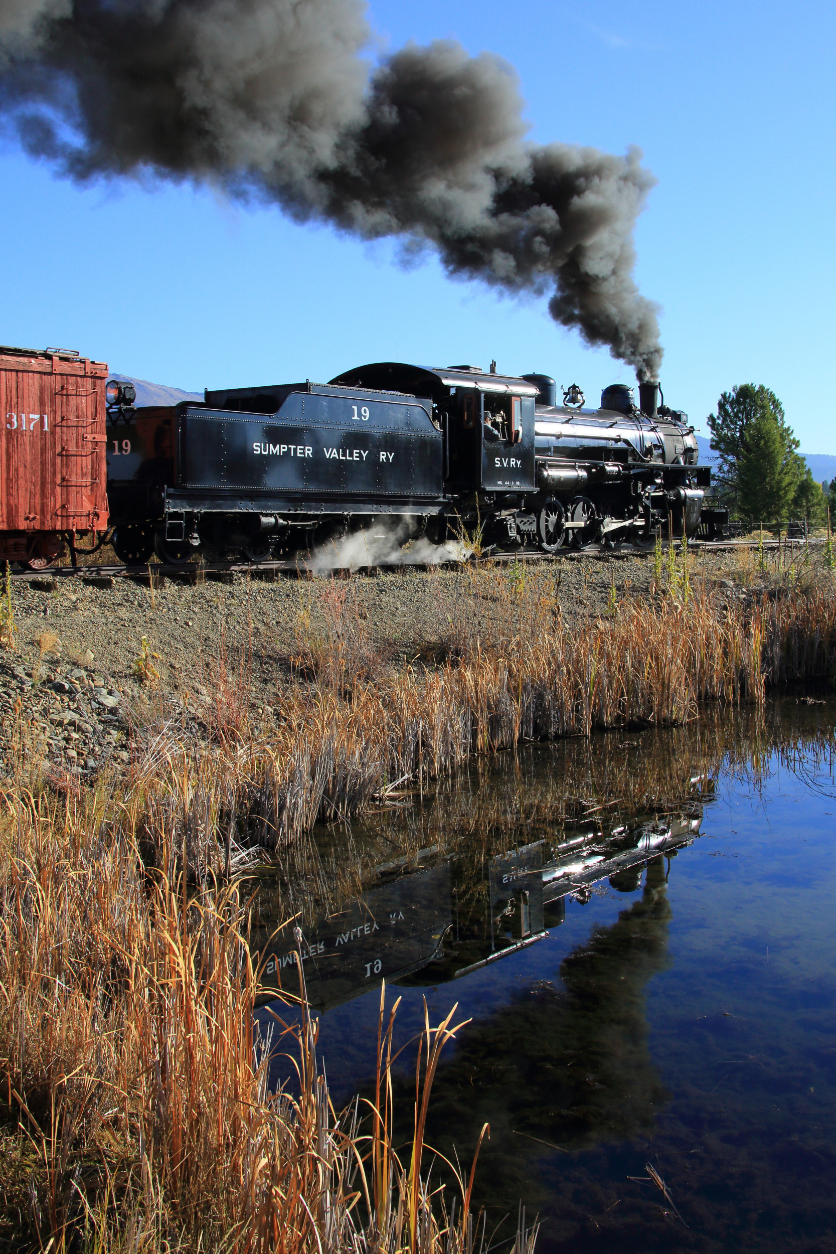 We’d start at McEwan pointed east, back the train to various points doing morning shots – primarily on the first couple miles of track. Most of the first two miles of the line line is cut through old dredge tailing rows along the Powder River. Three dredges worked these river bottoms between 1912-1954, scooping up river bottoms rich with gold and depositing the remains back in these barren parallel rock piles. (One dredge is now restored as a museum in Sumpter – the rotting wooden remains of at least one of the others can be seen in one of the ponds.) Between the piles lies absolutely still water, which we made ample use of for reflection shots.